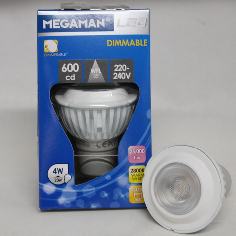 Megaman LED lamp 4W=35W. Deze LED-lamp heeft een GU10 fitting en geeft een warm-wit licht met een stralingshoek van 35 graden. De lamp is bovendien dimbaar.